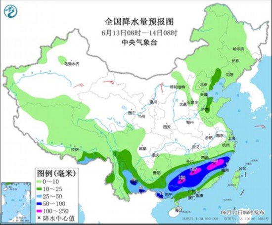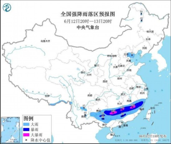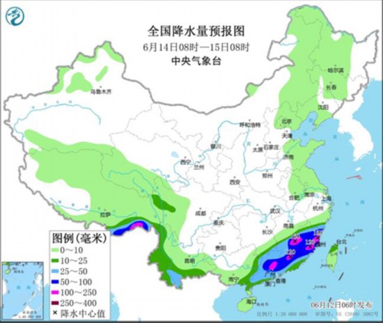 具體來看,12日20時至15日08時,江南中南部、華南以及貴州、云南、西藏東南部等地有大到暴雨,部分地區有大暴雨,局地有特大暴雨,其中,廣西中北部、湖南南部、江西中部和南部、浙江南部、福建北部和西南部以及廣東中北部等地的部分地區累計降水量為100~150毫米,廣西東北部、江西東南部、福建西部等地局地可達200~300毫米;上述地區最大小時降水量30~50毫米,局地可達80毫米以上,局地有7~9級雷暴大風或冰雹天氣。