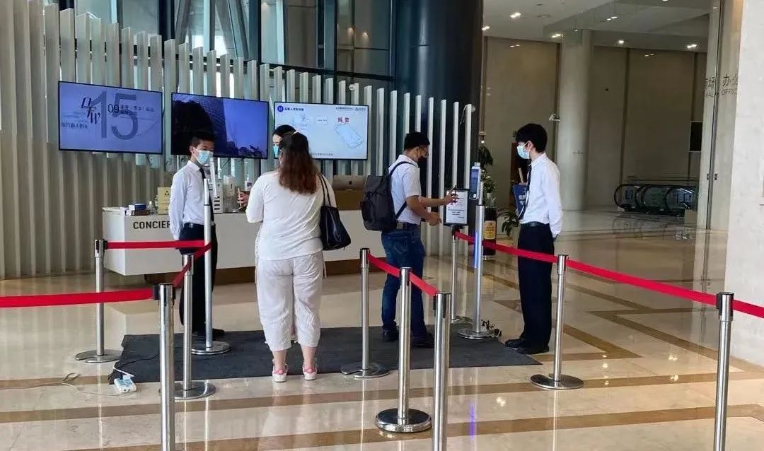 上午八點半,記者來到東方漁人碼頭寫字樓區域,聽見喇叭里循環播放著防疫通知,提醒進入大樓的員工正確佩戴口罩,提前打開健康碼。走進大堂,可以看見兩側分別陳列著兩臺“數字哨兵”,員工有序掃碼、快速通行。