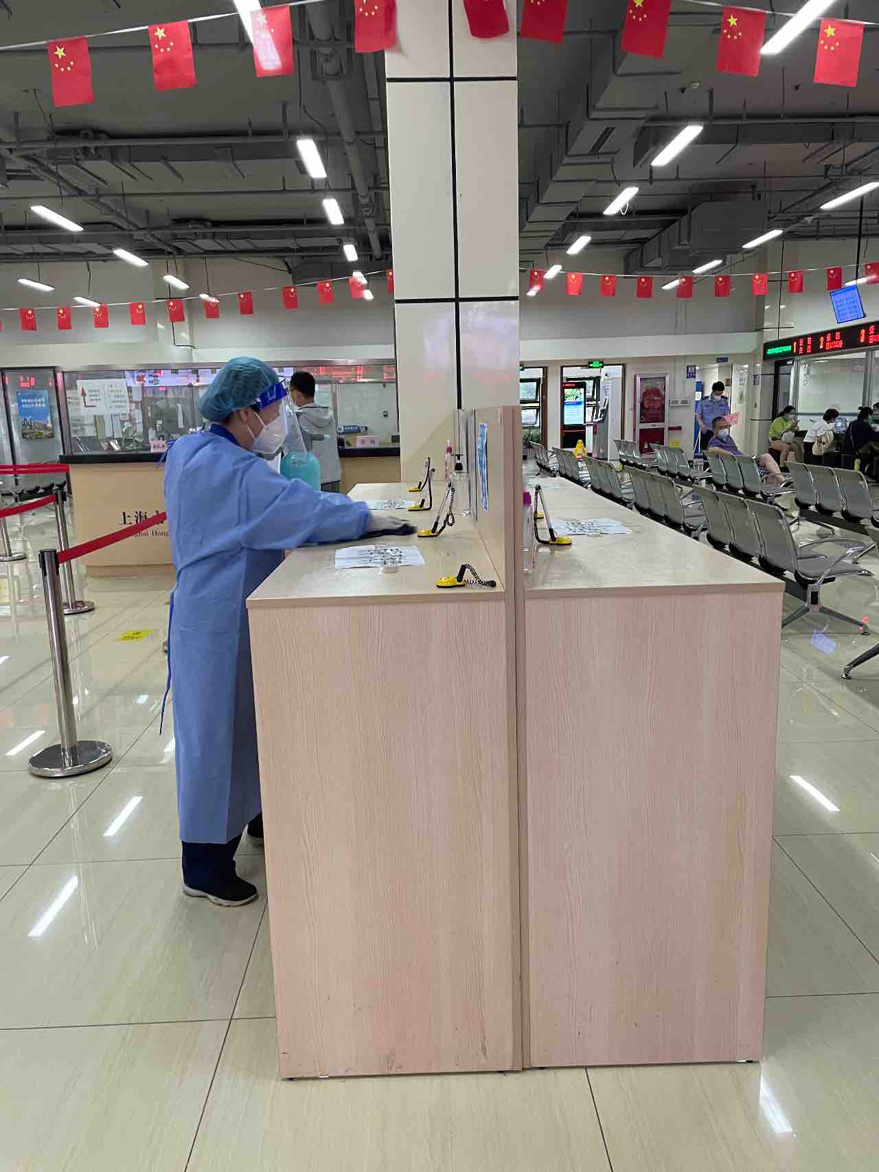 此外,中心嚴把大廳內的“消毒關”,中午暫停業務辦理,對大廳開展全面消毒。在業務辦理時間內,保潔員也會對人員觸碰較多的區域進行定時消毒,如信息自助查詢機、表單填寫臺等。