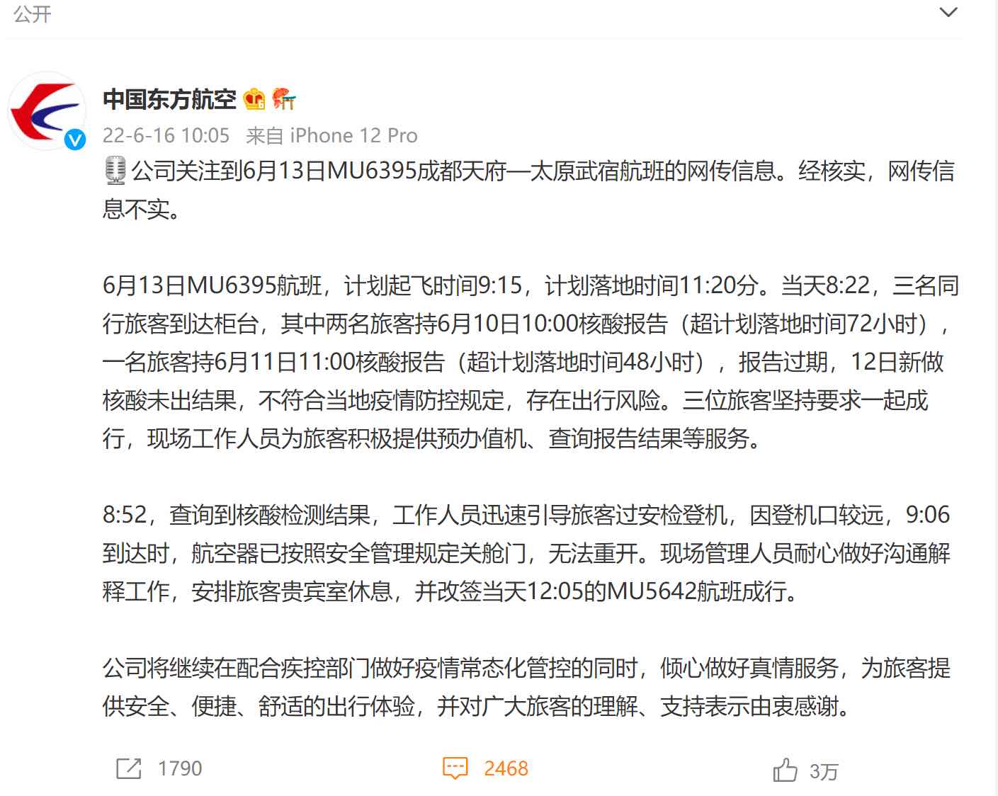 東航方面表示,公司關注到6月13日MU6395成都天府—太原武宿航班的網傳信息。經核實,網傳信息不實。