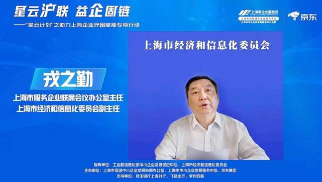 活動上,工業和信息化部中小企業發展促進中心主任單立坡、上海市經濟和信息化委員會副主任戎之勤、京東集團副總裁馮全普共同云見證“星云計劃”紓困賦能專項行動云簽約儀式,并共同云啟動“星云計劃”之助力上海中小企業紓困賦能專項行動,上海中小企業自6月16日起可登錄上海市企業服務云平臺了解享受相關服務。