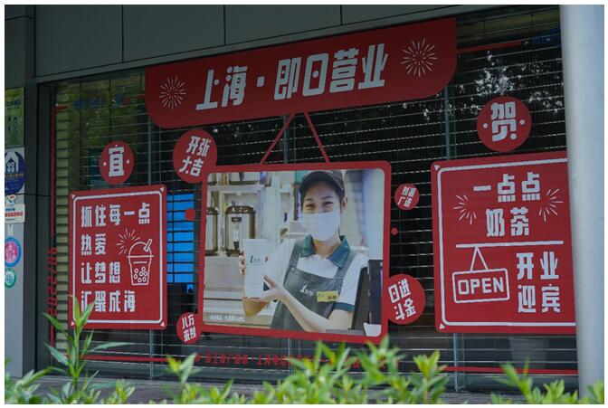 充滿朝氣又有產品特色的定制化宣傳語打動著往來消費者的心,國風剪紙設計加上喜慶的“開業紅”貼上櫥窗后更讓人眼前一亮。一家家開業的店鋪,一幅幅喜慶的畫面,為上海帶來恢復后的蓬勃生機,點亮了人們的日常生活場景,潛移默化的提振著整個城市及市民的信心。