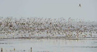 2017年12月6日,在崇明東灘鳥類國家級自然保護區灘涂上飛翔的鸻鷸類鳥群。 本報記者 張春海 攝
