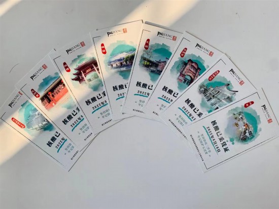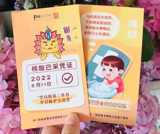 根據本市疫情防控要求,也為了方便市民就近核酸檢測,從現在起到7月底,各區每周周末都會安排一次社區篩查。明天就是周六,繼上周六“文化與自然遺產日”當天,閔行區浦江鎮給參加完核酸檢測的村居民,送上一張印有浦江非遺吉祥物IP“獬豸”和浦江國家級非遺項目“滬諺”的核酸已采憑證后,最新版的核酸已采憑證將再度登場,這次的主角依然是“獬豸”和“滬諺”。