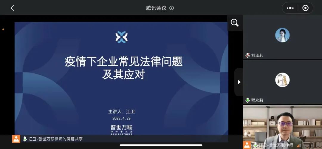 公司事務、合同管理、勞動人事、員工激勵、知識產權、爭議解決……企業經營發展方方面面的法律問題在疫情之后,面臨增長。為此,普陀區青商會借助其法律服務平臺,組建了一支由6家律師事務所、11名專業律師共同組建的公益法律服務團隊,推出了“拾時支持”公益法律服務計劃,為會員企業提供公益法律服務,以專業的法律服務力量助力企業疫情常態化階段的經營發展。