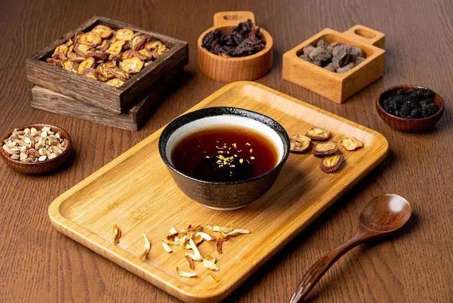 原料:烏梅50g、洛神花3朵、山楂15g、陳皮10g、甘草5g、桂花酌量、清水1500ml、冰糖