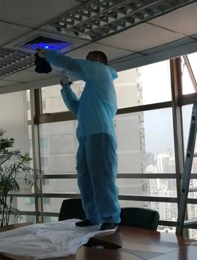 早上9點,身著防護用具的第三方作業人員進場,由兆豐廣場工程部人員全程監督、配合,按預先制定方案,嚴格執行消殺流程,逐層、逐單元地對空調設備的主機、管道、出風口、風機盤以及末端仔細清洗、消毒,保障消殺效果。