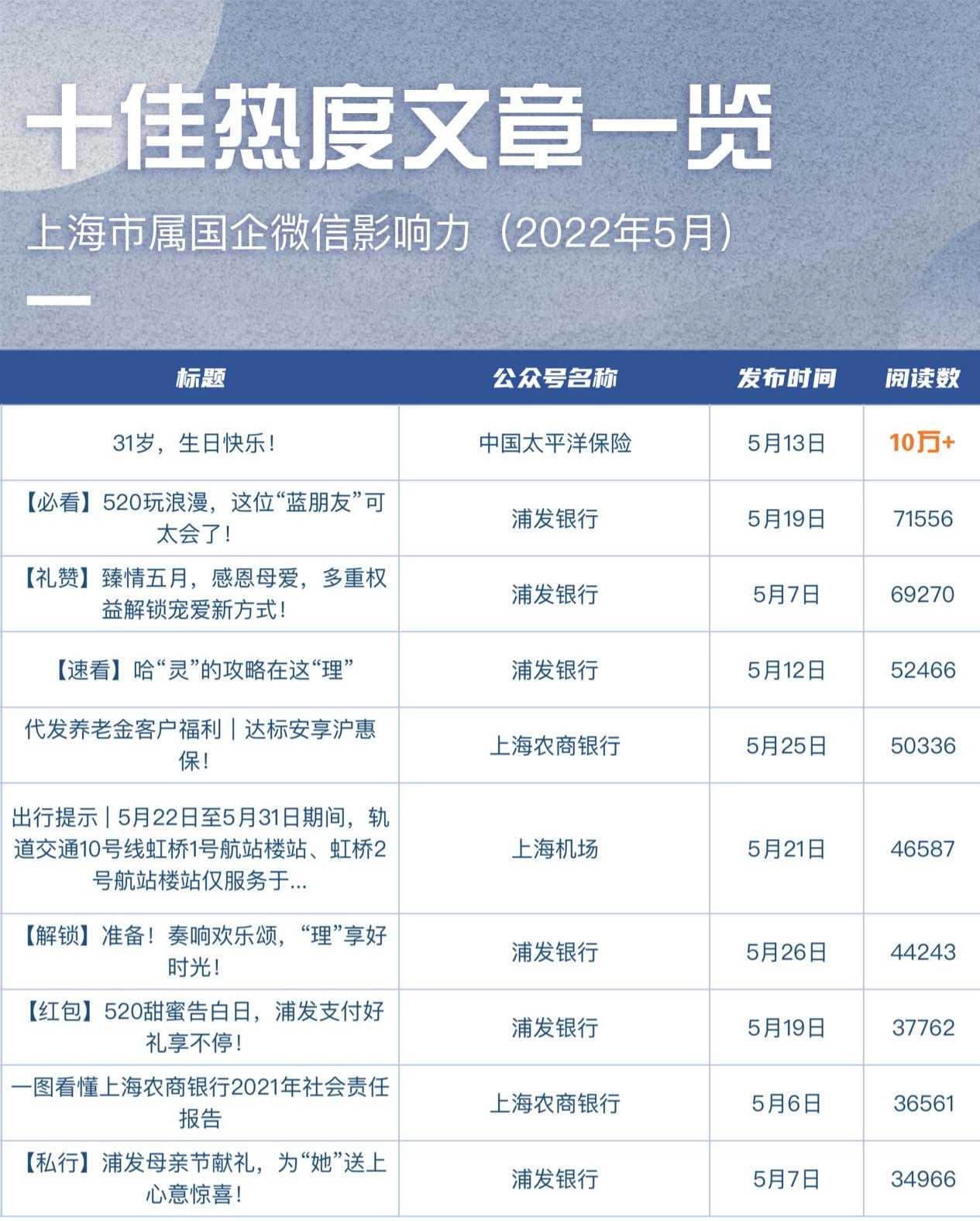 本期,我們對37家上海市屬國企微信公眾號2022年5月的發布信息進行了持續關注和深度分析。并分別以單篇爆款閱讀量、微信公眾號總閱讀量、傳播力等三個維度篩選出“上海市屬國企微信公眾號十佳熱度文章”“上海市屬國企微信公眾號十佳傳播力公眾號”以及“上海市屬國企微信影響力”。