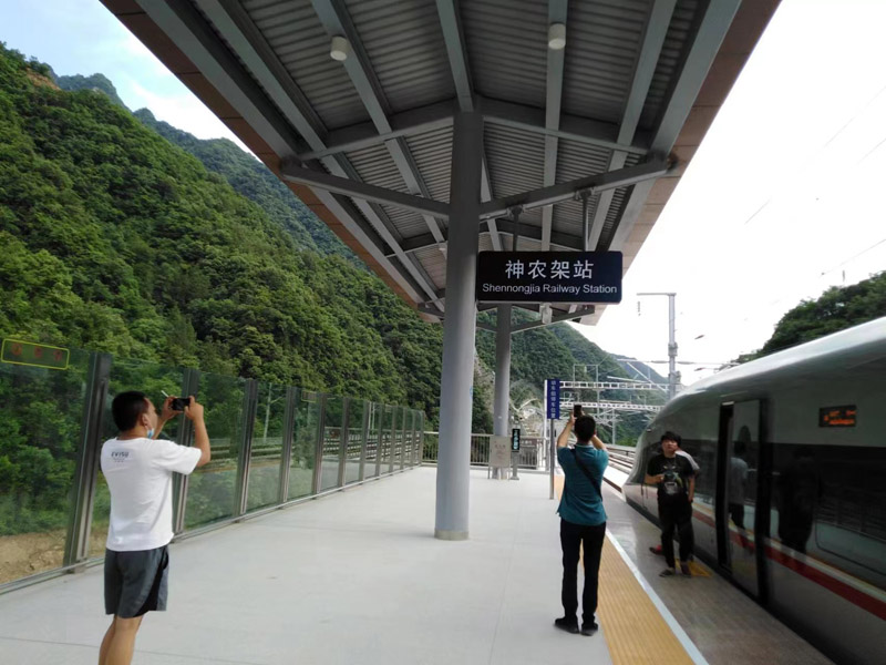 G1476次列車緩緩駛達神農架站,此舉標志著有著“華中屋脊”之稱的神農架正式邁進“高鐵時代”。旅客紛紛下車拍照留念,列車長陳飛洋正在給小朋友們介紹神農架的風景以及當地風土人情,在“華中屋脊”上架起一座高鐵站,也圓了神農架8萬人民期盼已久的高鐵夢。