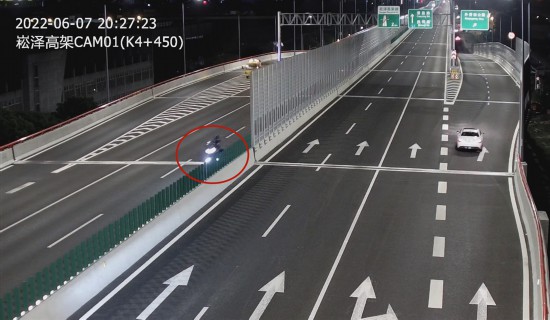 6月7日20時許,青浦公安分局交警支隊接到群眾舉報稱,有摩托車未按規定駛入崧澤高架路段。接報后,民警立即開展調查核實,根據報警人目擊車輛的位置調閱沿線的公共視頻,民警發現確實有兩輛摩托車各搭載一名乘客在崧澤高架道路上行駛。