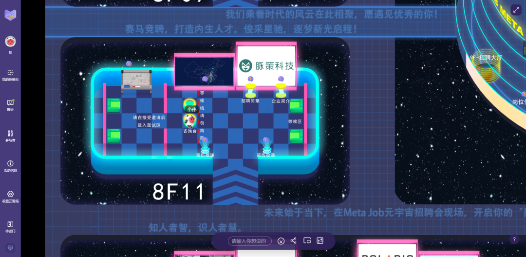 在元宇宙招聘大廳,場景高度模擬線下招聘會現場,招聘大廳的信息板塊接入了數據分析平臺datlas,應聘者只要點擊“信息板”就能看到整場活動數據,篩選出自己需要的信息,定向了解企業信息與崗位要求,快速定位與自身的匹配度。