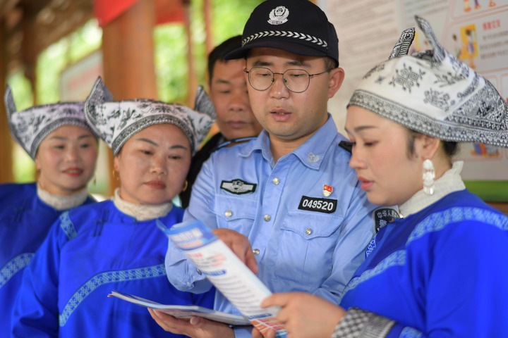 2022年5月17日,民警在貴州省三穗縣臺烈鎮寨頭村給村民講解防范電信網絡詐騙知識。 新華社記者 楊楹 攝