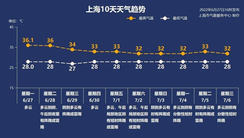 好消息是,雨水馬上要來解暑了。今天,滯留北方多日的主雨帶重返申城,受其影響,上海今明兩天午后會有強對流天氣。從周三到周日,最高溫回落到高溫線以下,在32到34℃徘徊。