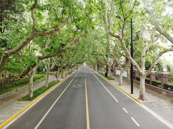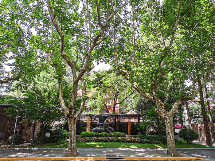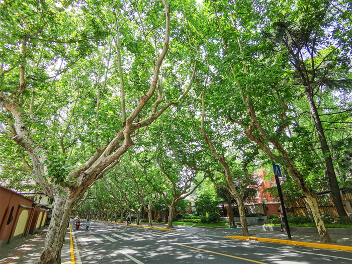 盛夏,是新華路最美的季節,兩側的懸鈴木伸展出茂密的枝葉交錯在馬路的上空,將這條“國賓道”圍成一條長長的林蔭“隧道”。微風裹著陽光在地面散下點點搖曳的光斑,行走在其中,可以感受到一絲令人舒暢的清涼。