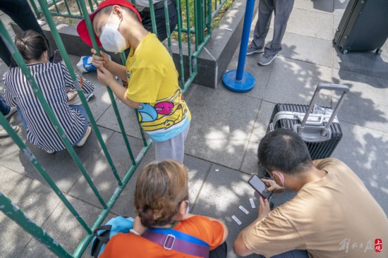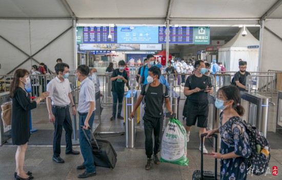 當天上午,在上;疖囌灸蠌V場,抵達和出行人流不斷,乘車旅客憑借24小時核酸陰性證明或48小時核酸陰性證明加24小時抗原陰性證明和當日車票有序進站乘車。