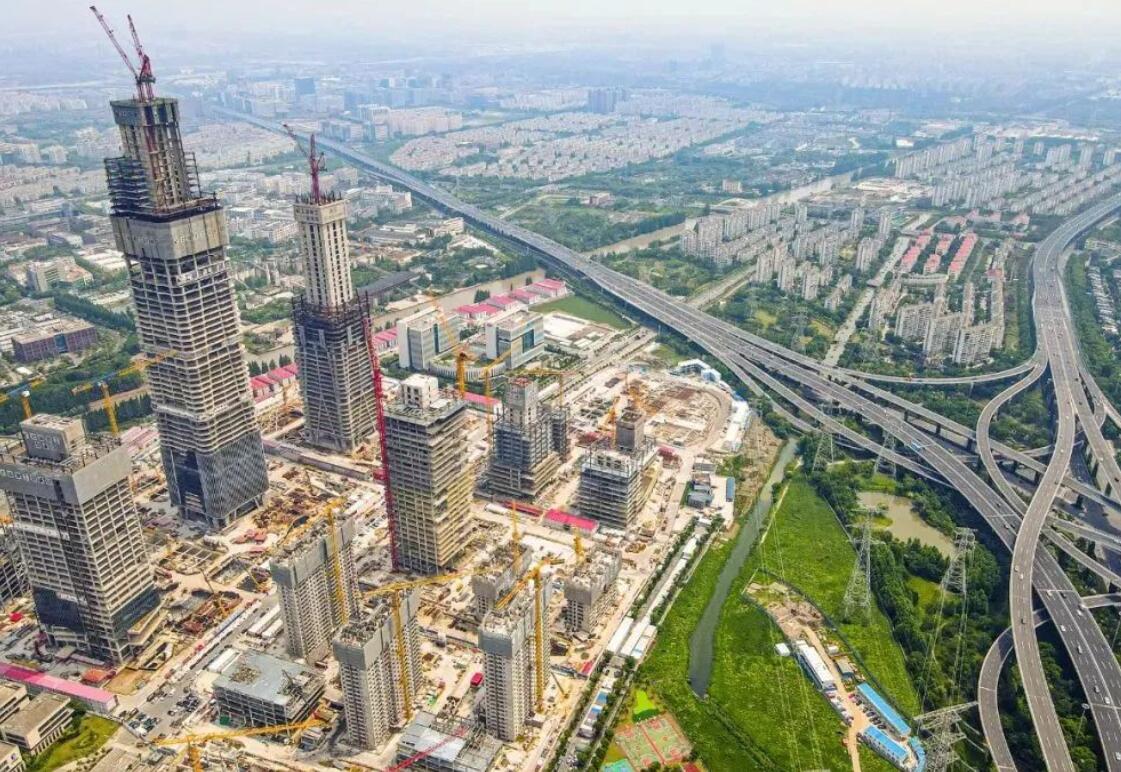 西塔核心筒已于去年年底完成結構封頂,目前外框鋼結構施工至56層。東塔核心筒施工至43層。