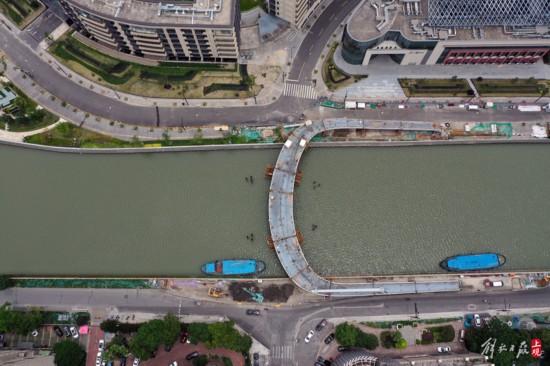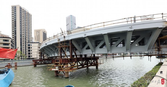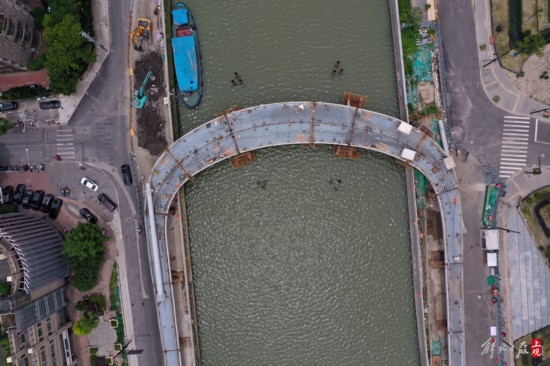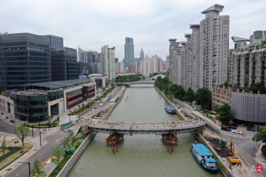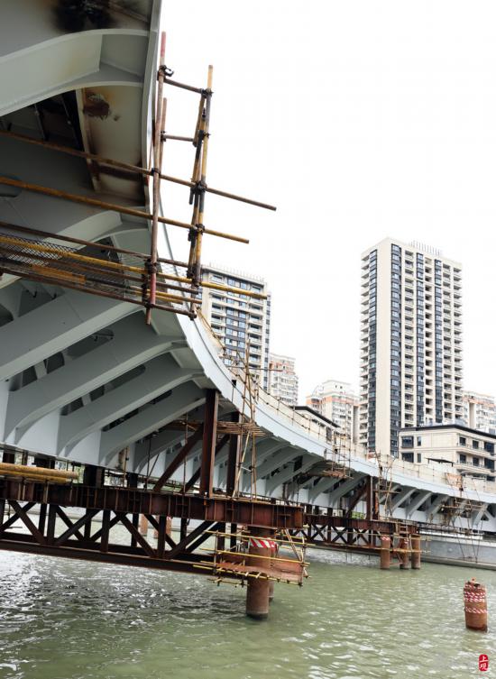 安遠路跨蘇州河橋新建工程,橫跨靜安、普陀兩區,主梁采取工廠預制、兩岸分段拼裝。
