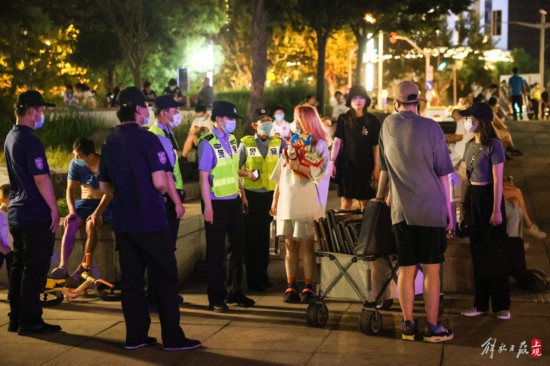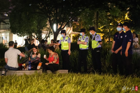 徐匯公安民警在濱江區域提醒人們各類注意事項。