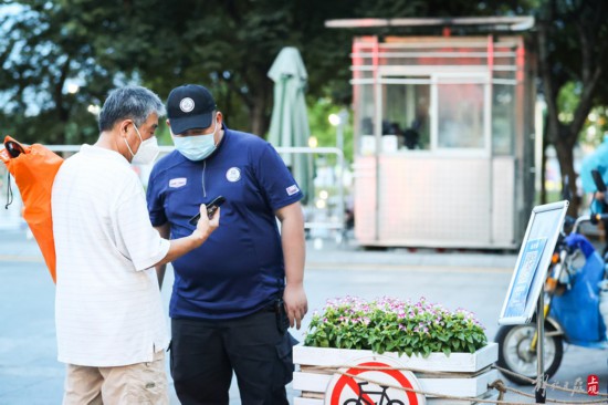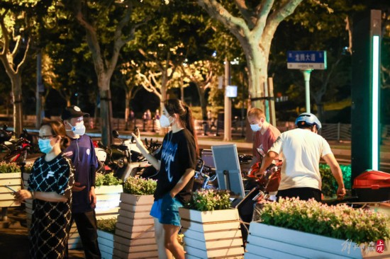 工作人員在徐匯濱江各入口處核驗人們的場所碼。
