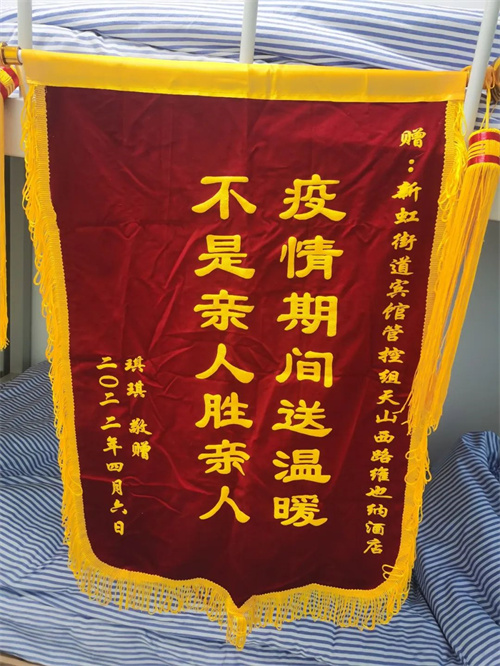 近日,一封令人動容的感謝信發到了黃菲的手機上,原來是一位名叫琪琪的年輕媽媽發來的,信中她感謝了黃菲,感謝了醫務彭婷和區水務局志愿者李若晨。原來她在4月初和自己2個月的孩子作為密接轉運到隔離酒店,但不久她就確診了,考慮到孩子離不開媽媽的情況以及當時方艙的實際情況,黃菲和團隊成員多方協調,讓媽媽和孩子留在了隔離酒店,同時還尋找渠道幫助他們購買了藥物、奶粉、母嬰用品,醫務人員每天也會給予關心,有時凌晨有問題孩子媽媽也能及時收到回應,最終孩子和媽媽倆人在酒店順利度過了隔離期。據悉這位琪琪媽媽為了表示感謝,在當時很多店鋪封閉的情況下,還多方聯系為酒店防控組做了錦旗。