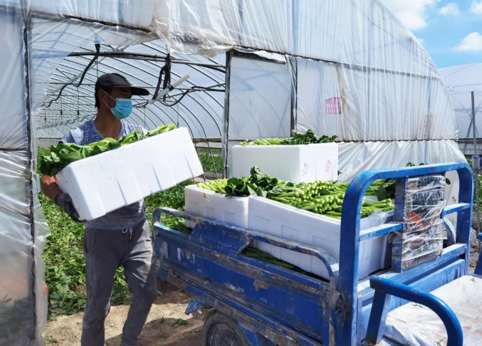 一顆顆綠葉菜被整齊地裝在塑料箱子里,準備裝車運輸。短暫的休息間,農場負責人為菜農送上礦泉水和毛巾,叮囑他們及時補充水分,防暑降溫。