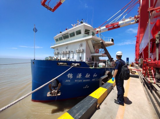國內首艘高能效江海直達集裝箱船舶靠泊洋山港