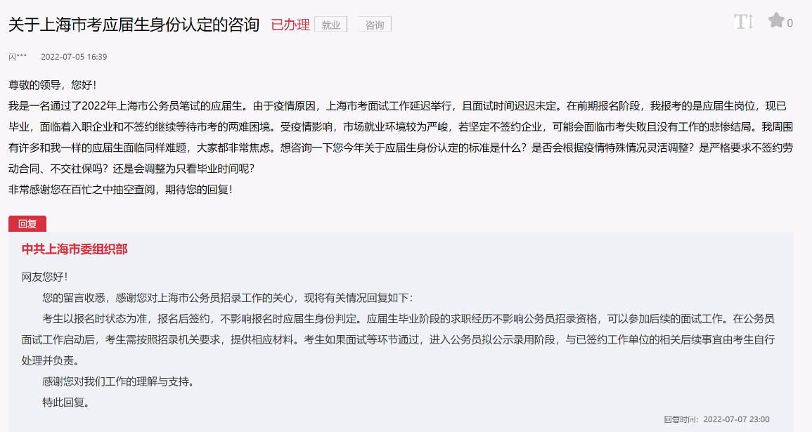 留言板 | 公務員考試應屆生身份如何認定?上海市委組織部回應