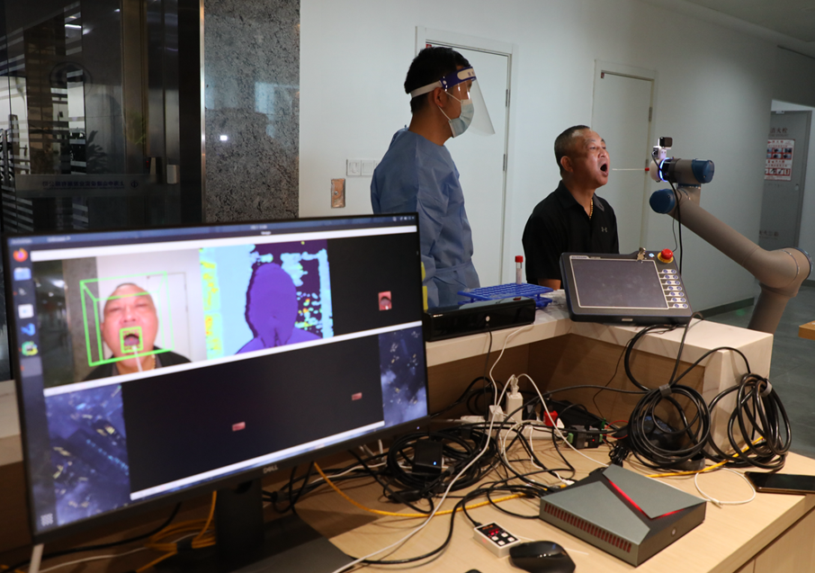 設備的研發單位上海優復博智能科技公司負責人孫振峰博士告訴記者:“這款機器人依托于公司自主研發的智能機器人核心算法集和系統軟件——yofoAIROS,綜合了人工智能視覺和力控混合感知控制技術,可以精準識別人臉部動作,隔空判斷并定位到采樣者的口腔位置,全程無需接觸輔助器材。每次采樣之前,人工助手進行手部消毒、空氣噴霧消殺,并且采用便攜式紫外消毒器對機械臂進行定向紫外消殺,過程中機械臂(頭部)自帶紫外消殺功能,既提高了采樣的安全性,也增強了采樣者的體驗感?!?/p>