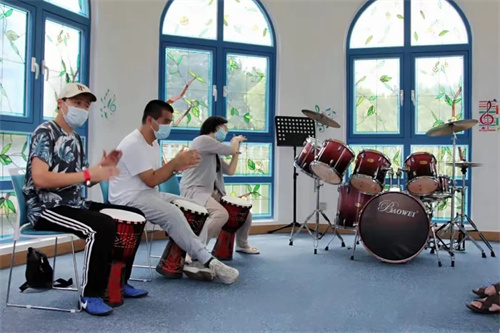 鼓樂聲聲、弦樂悠悠、聲樂郎朗三座藍亭,為孤獨癥孩子提供不同的療法