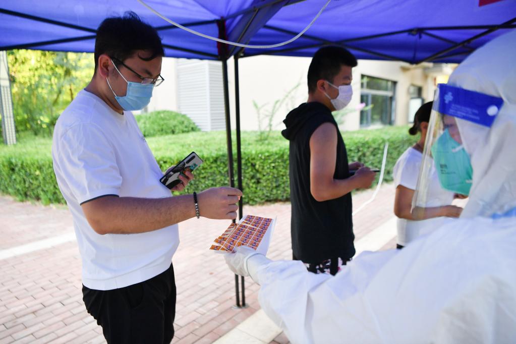 7月8日,志愿者(右)向西安市曲江新區紫汀苑社區居民發放核酸檢測貼紙。新華社記者 張博文 攝