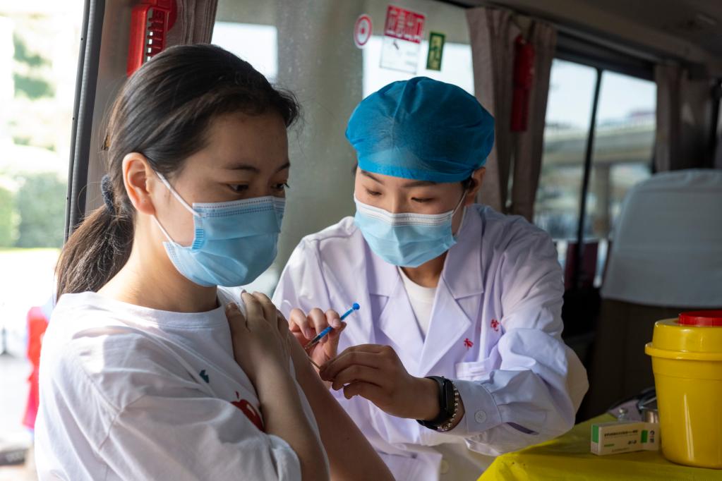 5月20日,在鄭州市金水區花園路與金水路交叉口,市民在新冠疫苗接種車上接種疫苗。新華社記者 徐嘉懿 攝