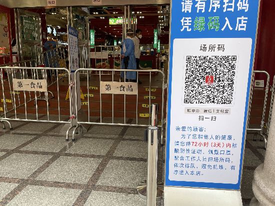 南京東路一家商店在門口張貼了場所碼,并布設數字哨兵,對進店顧客進行查驗。