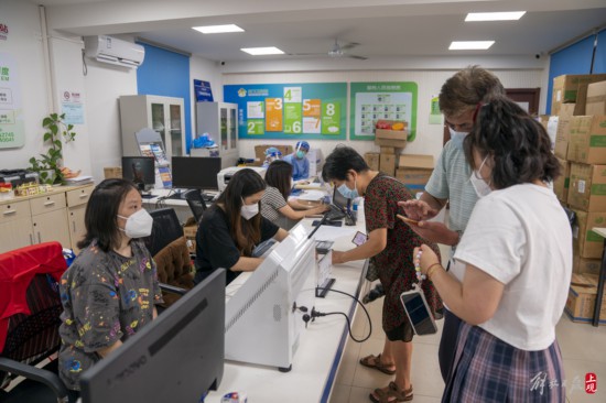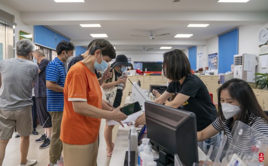 7月12日下午,在北蔡鎮下南居民區的老年人疫苗接種常態化專場,老人在社區工作人員的引導下進行登記、填表。
