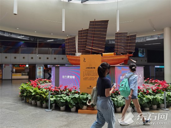 東方網記者黃麗春7月12日報道:“媽媽,你看那里有艘船!”“看起來是一艘中國古代的船,我們過去瞧瞧?!钡罔F人民廣場站1號線2號線換乘大廳里,一艘撐起五根桅桿展開帆板的木船,吸引了一對母子駐足停留。他們在文字介紹《上海五桅沙船》前仔細閱讀著,并饒有興趣地看完了現場循環播放的記錄片《上海:沙船的故鄉》……