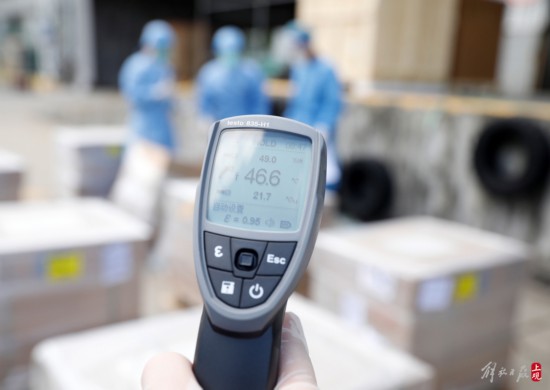 7月12日13時30分,浦東機場海關一線關員在 浦東機場第二監管倉儲區 根據風控部門布控查驗指令對進出境貨物實施查驗。當時戶外環境溫度為46.6℃。