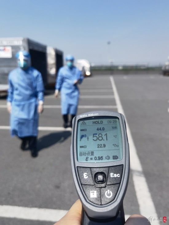 7月12日下午14時30分,浦東機場海關一線關員在聯邦快遞(中國)有限公司上海分公司內開展快件類海關監管作業場所現場巡查和盤庫等工作。當時戶外環境溫度達58.1℃。