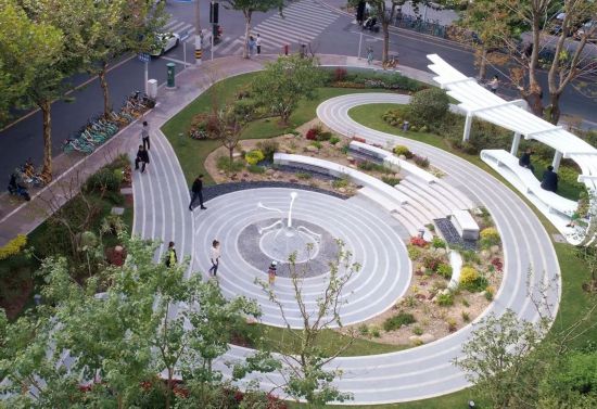 “音花園”設計中用樂器和五線譜衍化的設計語言重塑綠地空間,留聲機雕塑、風琴廊架、琴譜路徑、跌水……即為市民群眾提供了可遮風擋雨、休閑游憩的空間,又通過精致的設施提升了口袋公園的景觀水平。