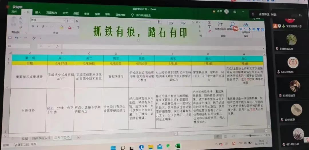 如何在炎熱的暑假中,保持一顆寧靜致遠的心境,讓美好的暑期計劃落在實際行動中?暑假一開始,上海理工大學附屬實驗初級中學召開線上“創美一夏”暑期心語主題班會,分享同學們的暑期計劃。蔡愉洋同學不但與大家分享了暑期計劃,還介紹了關于計劃落實情況的每日自查表,把自己的自查表定期給班主任和導師看?!斑@是承諾,也是自我鞭策?!辈逃溲笸瑢W表示。