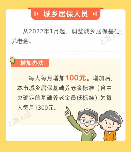 與此同時,本市從2022年1月起,調整城鄉居?;A養老金,每人每月增加100元。增加后,本市城鄉居?;A養老金標準(含中央確定的基礎養老金最低標準)為每人每月1300元。