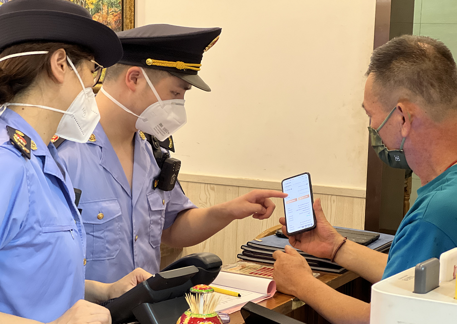 在位于曲陽路的艾尼巴伊餐廳,執法人員先后查驗了店鋪從業人員的健康證、核酸檢測記錄和店鋪消毒記錄等疫情防控措施落實情況,并通過手機端口,現場檢查該店鋪場所碼的刷掃情況。