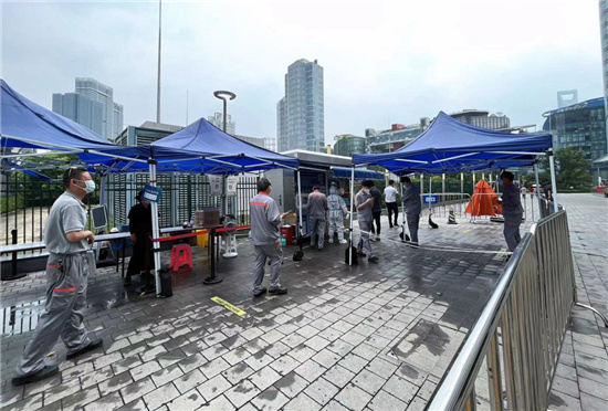 上海家化是虹口的重點企業,在家化大廈門口,一座專屬“核酸檢測亭”正迎接樓宇內的企業白領進行核酸采樣,人均排隊時長5-10分鐘。