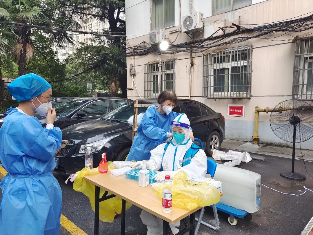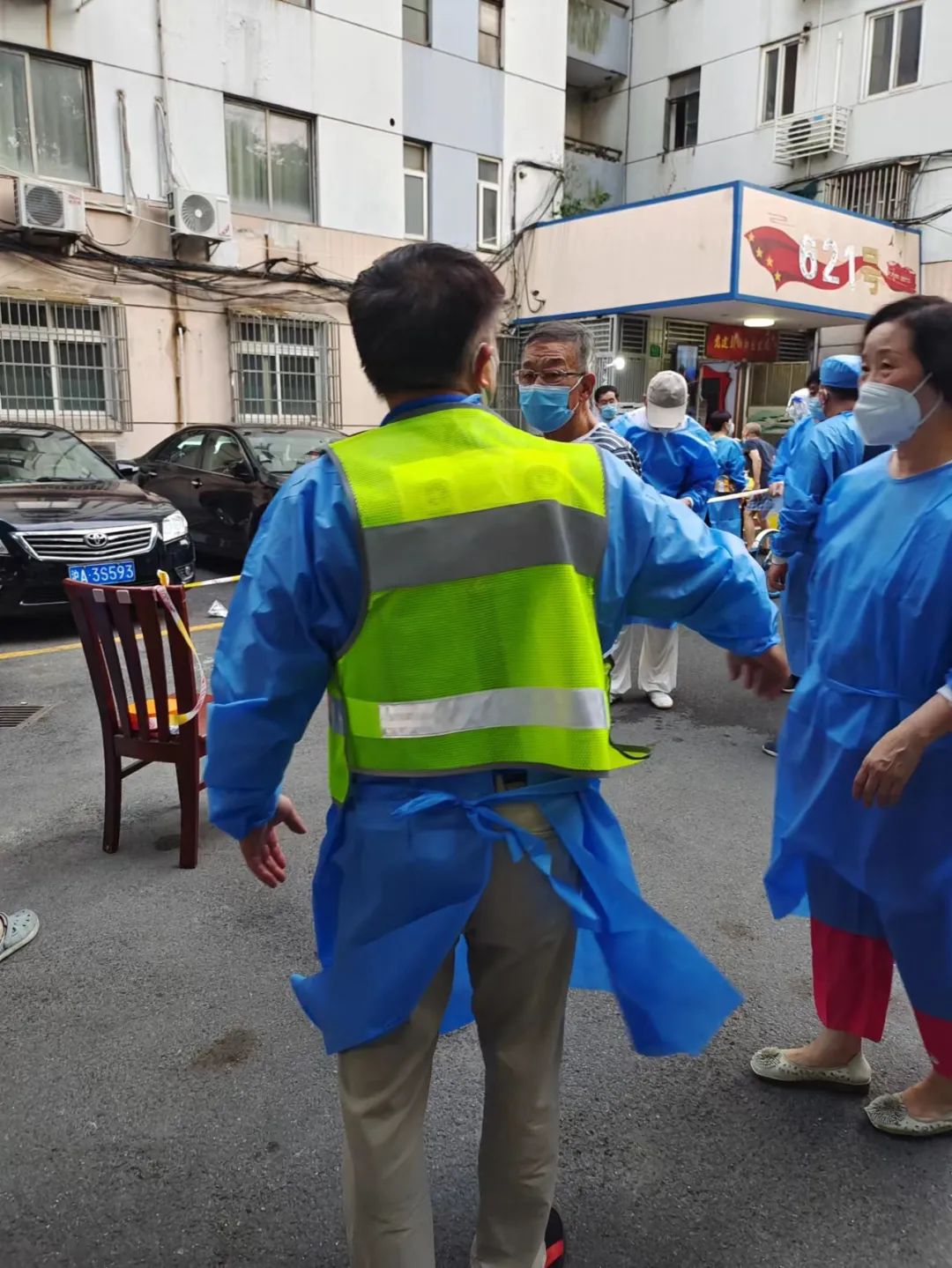 在曲陽社區核酸“大篩”現場,曲陽路街道為“大白”和志愿者們提供了“冰馬甲”,這款被譽為“降溫神器”的馬甲,為工作人員帶去些許涼意。