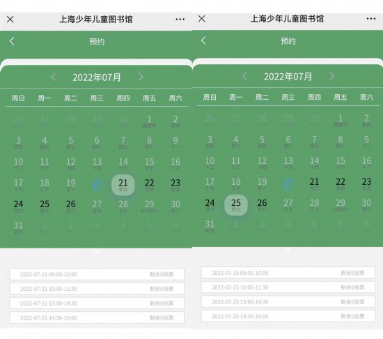 上海少年兒童圖書館預約頁面截圖,7月21日和25日顯示“剩余0張票”