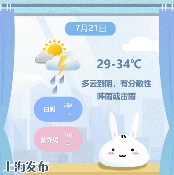 今天申城多云到陰,有分散性陣雨或雷雨,西到西北風3-4級,雷雨時陣風7-9級,風向偏北,全天氣溫在29-34度之間,體感有些悶熱。受副熱帶高壓影響,明天起申城將再度開啟持續高溫模式,好在強度沒有上一輪強,但持續高溫天數增多,預計7月下旬高溫日超9天,且多午后雷陣雨天氣。小布提醒大家,注意防暑降溫,出行記得雨具常備。