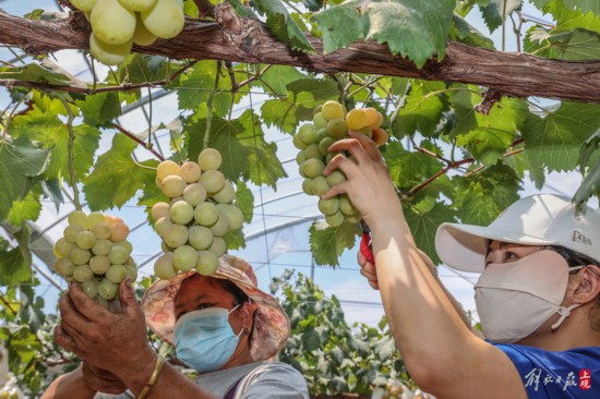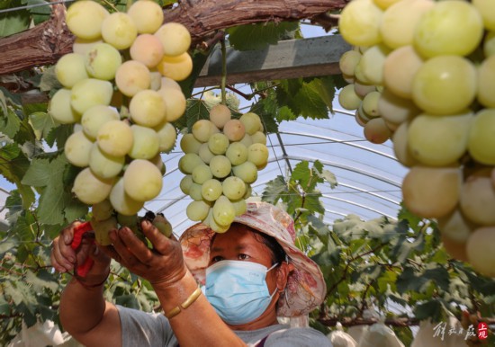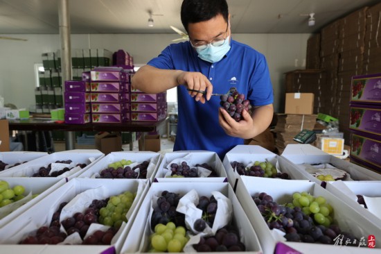 正在給葡萄打包的技術員說,“我們這個葡萄都是當天采摘、當天發貨。爭取在24小時內送到客戶手上,讓客人吃到最新鮮的葡萄?!?/p>