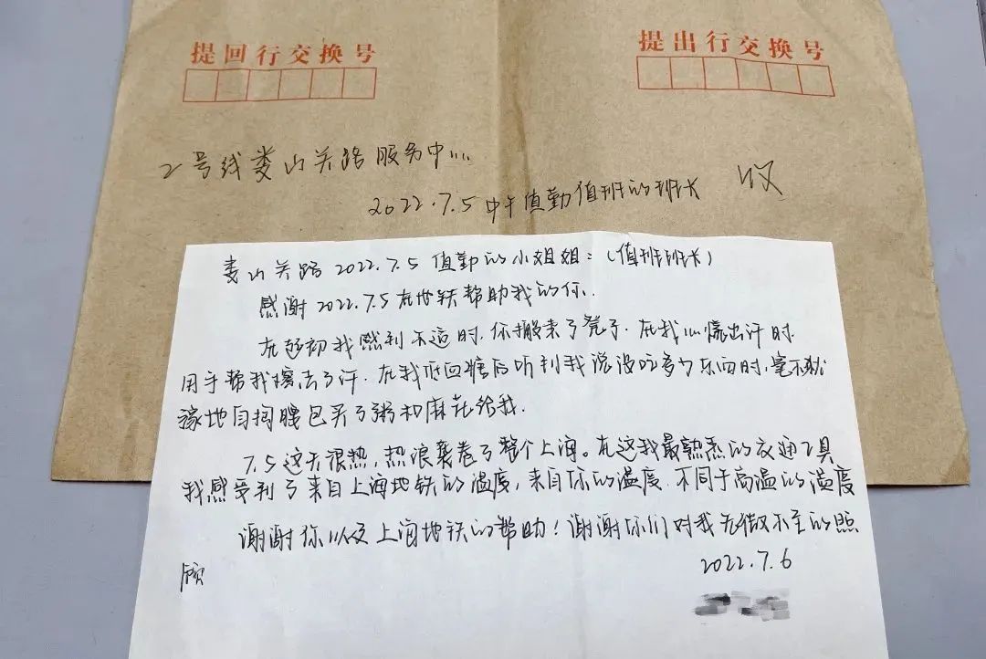 “真的感謝你們幫助我女兒,也要謝謝那位一直陪伴她、照顧她的站長?!痹诘罔F2號線婁山關路站服務中心處,一位女士拿著一封感謝信找到了工作人員,她表示自己的女兒幾天前在這里因低血糖暈倒,多虧當時的值班站長悉心照顧,女兒身體很快恢復正常,可當時她們著急回家休養,沒來得及向那位站長表達感謝,所以這次專程送來女兒手寫的感謝信,表達她們一家的感謝之情。