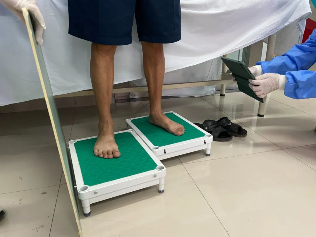 “右腳踩在這塊板子上,另一只腳跨過去?!?月21日上午8點,在金山衛鎮社區衛生服務中心糖尿病足篩查現場,醫護人員在復旦大學附屬中山醫院和金山醫院血管外科專家們的帶領下,引導老人在足底壓力測試儀上進行檢測。