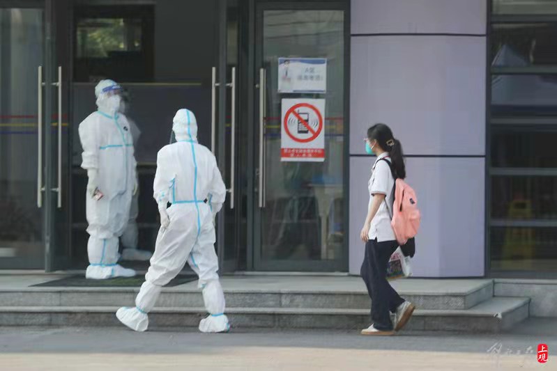 好在開考前,一位老師告訴她,如果空調熱了或冷了,可以及時讓他們調節。原本一句稀松平常的提示,在這個被疫情升級的嚴肅氛圍里,讓張楓崟備感溫暖,“好像一下子就沒有那么緊張了”。