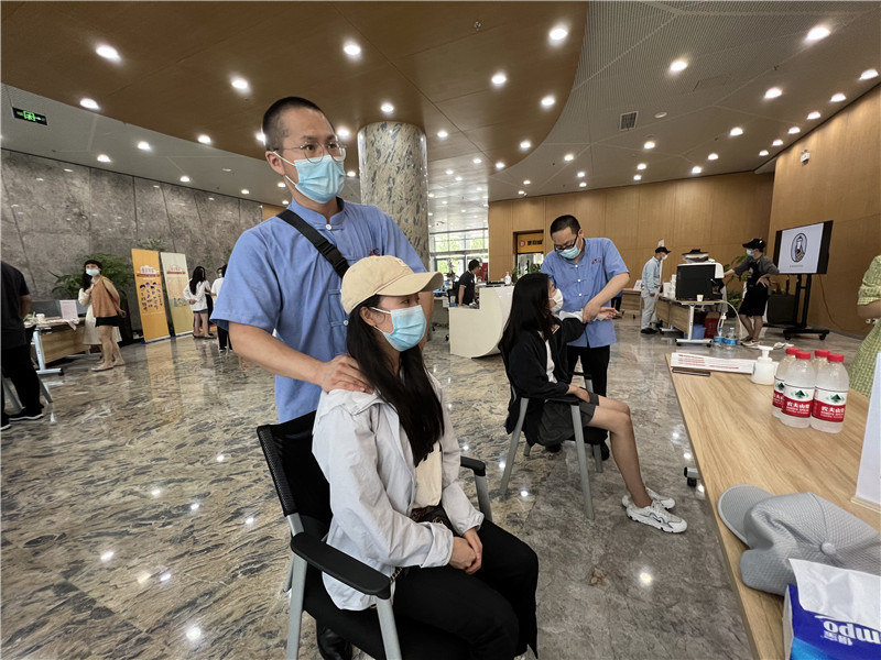 科創園區內,大部分都是IT男,長期伏案工作,少不了肩頸酸痛。一位男士在體驗按摩后,活動了一下筋骨,笑著對按摩師傅說:“我又滿血復活了?!?/p>