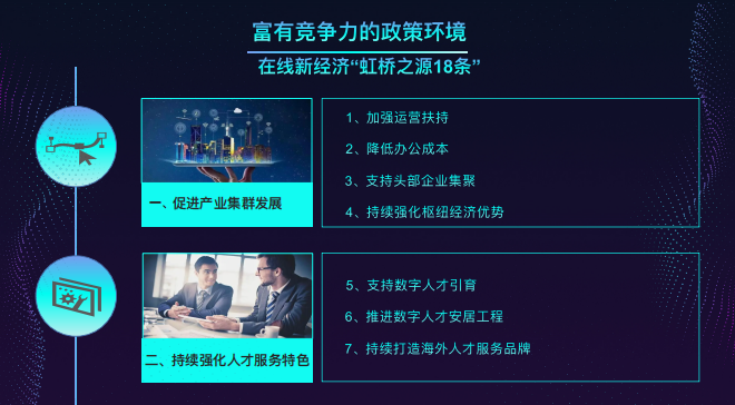 張偉表示,長寧“虹橋之源”在線新經濟生態園區位優勢優越,產業積淀深厚,致力打造成為全國經濟高質量發展和數字化轉型的樣板間,著力營造全要素支撐、全生命周期支持的政策環境。通過虹橋國際開放樞紐建設和城市數字化轉型兩大發展戰略聯動協同,“虹橋之源”“數字長寧”“國際樞紐”三大品牌疊加賦能,聚焦突出人才高地引領,體現生態裂變效應,打造一流營商環境,凸顯戰略牽引,疊加四大政策支持原則,圍繞促進產業集群發展、持續強化人才服務特色、支持數字化賦能與場景應用、鼓勵協同創新和優化產業生態五大方面,推出相應扶持政策,全面推進“虹橋之源”在線新經濟生態園建設。